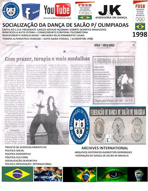 E aqueles que não conhecem sua própria historia não conhecem a si mesmos. Então Respeite e conheça a nossa historia blog assessoriaemdanca.blogspot.com flickr youtube instagram facebook KLEIBERTON DOMINGUES ZAP (61) 98418+7263 PATROCINE CBDS CAMPEONATO BRASILEIRO DANÇA DE SALÃO 2021/2022 História da criação da primeira FEDERAÇÃO DE DANÇA DE SALÃO DO BRASIL, constituída em Brasilia - DF Brasil, no dia 08/11/1999 conforme . registro histórico em cartório de pessoas jurídicas, com esfera de atuação a nível internacional, nacional na apresentação da dança de salão como modalidade desportiva, e cultural de apresentação e competição olímpica. Primeira entidade nacional de dança voltada ao esporte, campeonatos nacionais e socialização do esporte olímpico, ao melhoramento da saúde e social. Buscando estabelecer apoio com entidade publicas privadas através de convênios, através de federações , estabelecendo normas, critérios técnicos, regras, para competições no desporto nacional e internacional. Busca composição, prospecção de grupos de atletas de alto nível para socializar a dança olímpica, já haviam feito series de ações locais, regionais, nacionais e internacionais, projeção e prospecção sob o trabalho para olimpíadas desde 1997 conforme registro em jornais da época, junto ao Comité Olímpico internacional, C.O.I. Comité Olímpico Brasileiro, C.O.B. e I.D.S.F. Comité Olímpico Brasileiro, Instituto Nacional Desenvolvimento do Esporte, Presidência da Republica e Ministérios da Cultura e Ministério dos esportes antecessora da criação e posteriormente com inúmeras ações em prol da dança desportiva do Brasil conforme recebimento e protocolo de registros em oficios. Motivo firmado em estatuto que levou a formação da FEDERAÇÃO DE DANÇA DE SALÃO DE BRASILIA, entidade sem fins lucrativos, foi buscar a formação da CONFEDERAÇÃO BRASILEIRA DE DANÇAS DE SALÃO com objetivos e finalidades, regularizar a nível nacional e internacional, para representar a nível internacional, Brasília e demais entidades do Brasil em competições internacionais e seletivas para olimpíadas. Foi aberta democraticamente buscou juridicamente assumir todas obrigações F.D.S.B. legalmente de foma inteligente, responsável solidaria, participativa, solidária associar, filiar, regularizar, registrar, Federações, academias, professores de danças, associações, clubes, grupos de danças, para formar ligas direcionando-os e orientando-os ao esporte e desporto da dança de salão em competições regionais, nacionais e internacionais, participação em shows, eventos de nível elevado, diferenciado de alto rendimento na cultura e esportes. Tendo seus primeiros Presidentes empossados no Brasil - Brasília - DF, no dia 27/10/1999 - Exma Sra. ROSILENE SANTOS Exmo. SR. KLEIBERTON DOMINGUES que assumiram, desenvolveram, seguiram a risca objetivos, metas, obrigações as atividades da entidade .